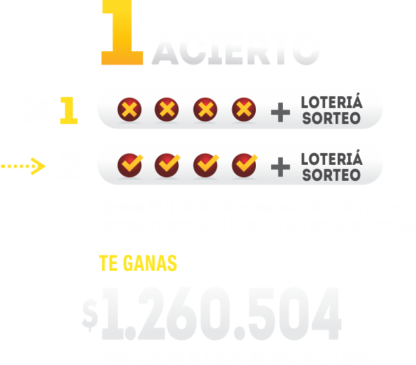 El jugador ganará el premio acumulado de CHANCE MILLONARIO, cuando uno (1) o dos (2) de los cinco (5) números de cuatro (4) cifras consignados en el formulario coincidan con las cuatro últimas cifras de los resultados del premio mayor de las dos (2) loterías o juegos autorizados señalados por el Jugador, o con el resultado del premio mayor de una (1) lotería tradicional y el resultado de un (1) juego autorizado. En caso de resultar más de un ganador, en un solo ciclo de juego del acumulado de CHANCE MILLONARIO, el premio se dividirá en partes iguales entre los ganadores. Cuando alguno de los cinco (5) números de cuatro (4) cifras consignados en el formulario coincida únicamente con el resultado del premio mayor de una (1) de las dos (2) loterías o juegos autorizados señalados por el jugador, le pagarà a este un premio mínimo equivalente a ($3.000) por cada peso apostado, calculado sobre el valor apostado a cada número sin IVA (Números apostados divido en 10 es igual a 420, valor que se multiplica por $3.000, lo que nos da un total de $1.260.504) como se describe en el decreto 176 de 2016 – sección 1 – Art. 2.7.2.2.1.1 Numeral 1, literal c.