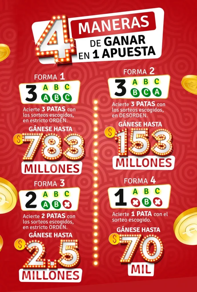 Por el acierto de un (1) número de dos (2) cifras con el resultado de las dos últimas cifras en su orden del juego autorizado o lotería seleccionada por el jugador, ganará siete (7) veces el valor apostado. Por el acierto de dos (2) de los tres (3) números de dos (2) cifras seleccionados por el jugador con los resultados de las dos últimas cifras de dos (2) de los juegos autorizados o loterías seleccionados por el jugador en orden, ganará doscientas cincuenta (250) veces el valor apostado. Por el acierto de los tres (3) números de dos (2) cifras seleccionados por el jugador con los resultados de las dos últimas cifras en su orden de los juegos autorizados o loterías seleccionados por el jugador en diferentes órdenes, ganará quince mil trescientas veintiséis (15.326) veces el valor apostado. Por el acierto de los tres números de dos (2) cifras con los correspondientes resultados de las dos últimas cifras de los juegos autorizados o loterías seleccionados por el jugador, ganará setenta y ocho mil trescientas (78.300) veces el valor apostado.