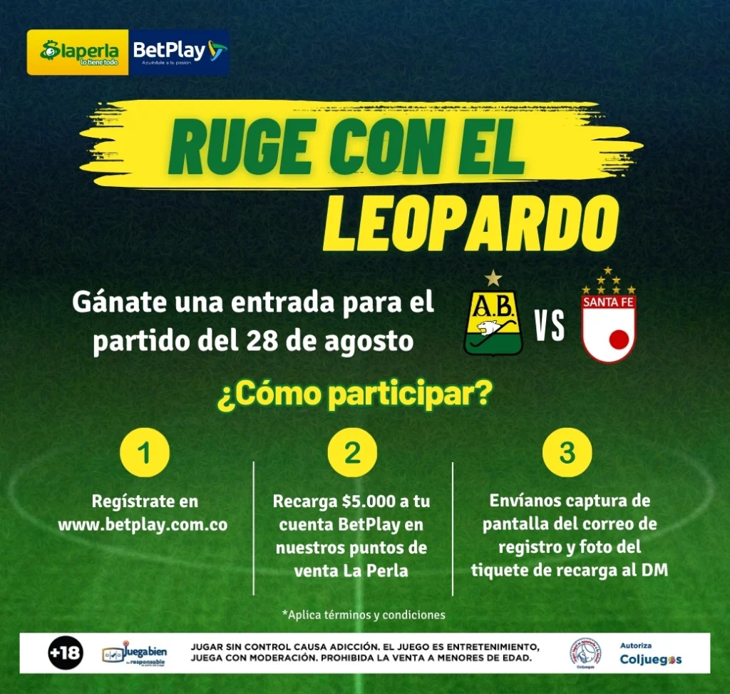 Desde las 2:00 p.m. del 21 de agosto hasta las 11:59 a.m. del 23 de agosto de 2024, todos los clientes de Apuestas La Perla que cumplan con los siguientes requisitos tienen la oportunidad de ganar 1 de 20 boletas para asistir al partido del Atlético Bucaramanga vs Independiente Santa Fe.