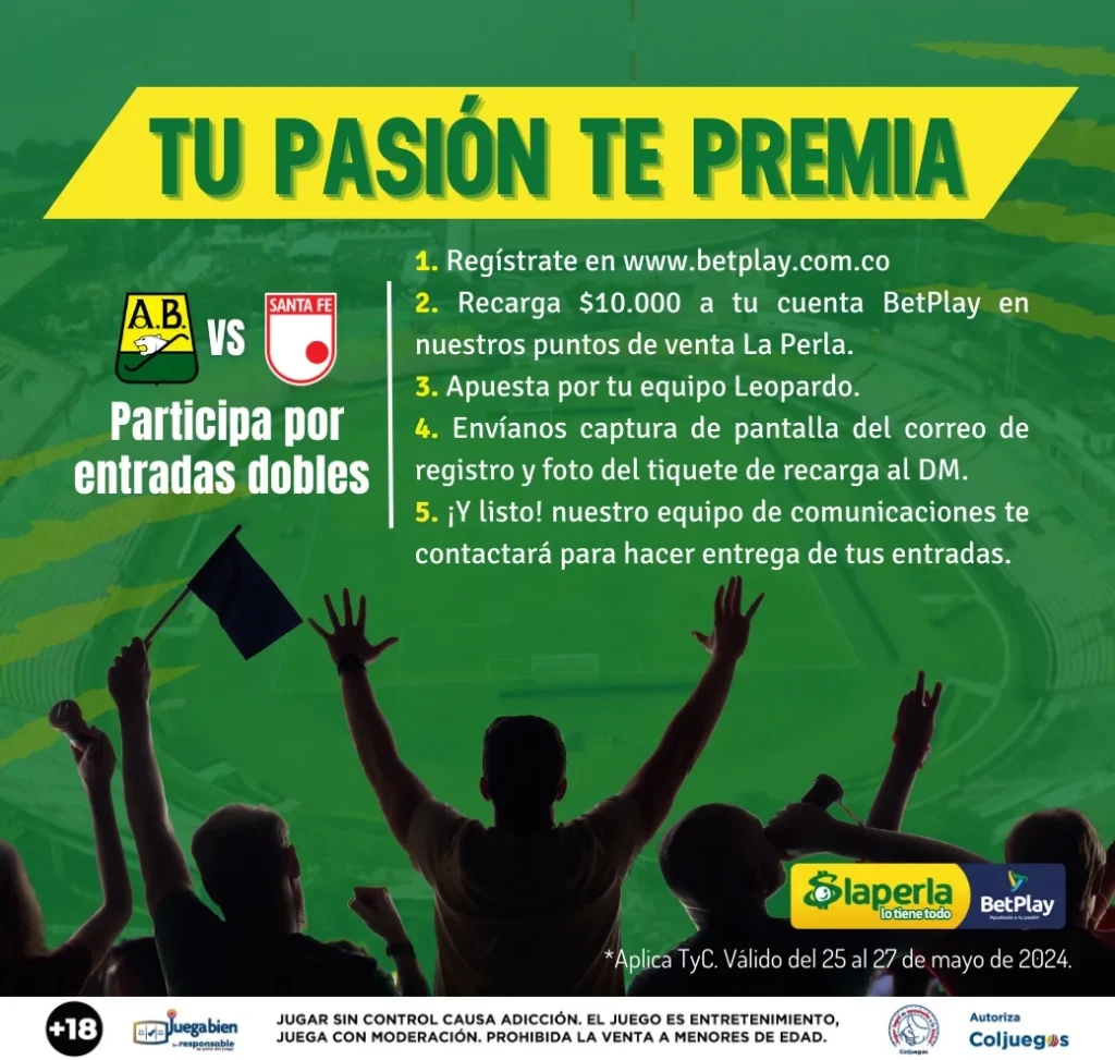 Del 25 al 27 de mayo de 2024, todos los clientes DE Apuestas La Perla que cumplan con los siguientes requisitos tienen la oportunidad de ganar 1 de 30 pases dobles para asistir al partido del Atlético Bucaramanga vs Independiente Santa Fe: