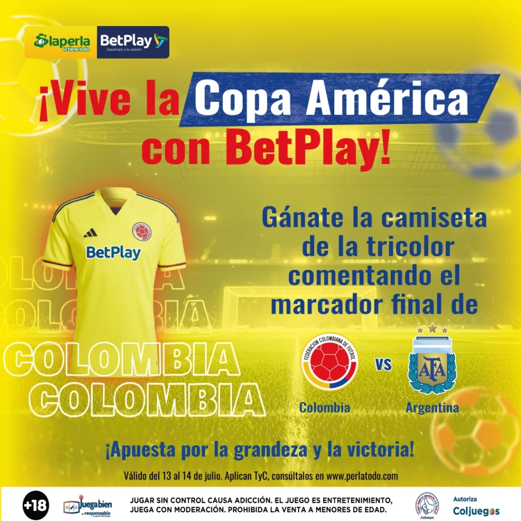 Gánate la camiseta oficial de la selección Colombia acertando el marcador final del partido Colombia vs. Argentina en la sección de comentarios de la red social Facebook de Juegos y Apuestas La Perla. Participa desde las 8:00 A.M. del 13 de julio hasta las 5:00 P.M. del 14 de julio del 2024.