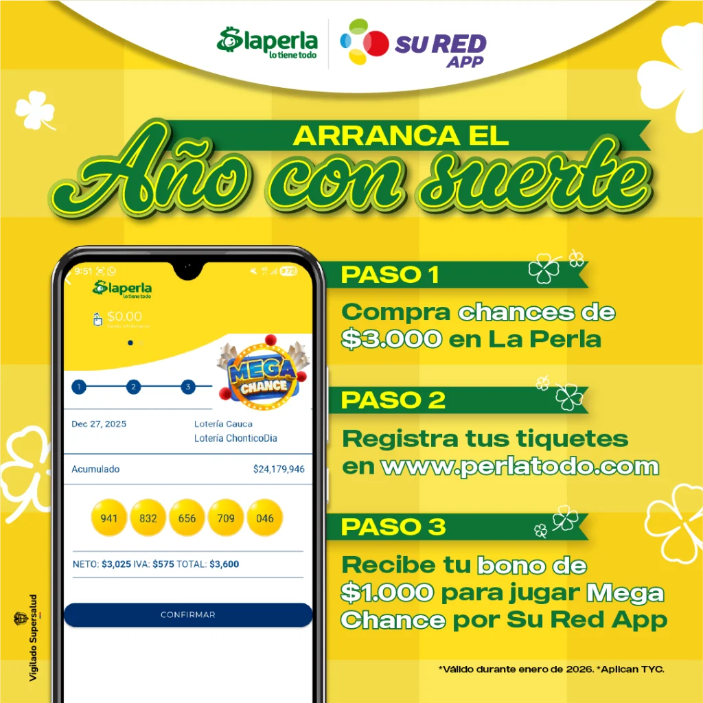 Del 1 al 31 de enero de 2026, todos los clientes que adquieran chances desde $2.000 de tradicional (4 cifras, 3 cifras, 2 cifras, 1 cifra, combinado de 4 cifras y combinado de 3 cifras) y registren el serial del tiquete comprado en https://perlatodo.com/perla/arranca-el-anio-con-suerte/  participan por bonos de $1.000 para jugar Mega chance en Su Red App.