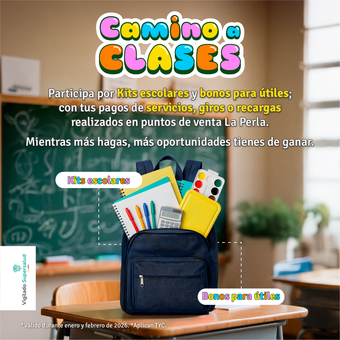 Camino a clases Del 1 de enero al 28 de febrero de 2026, todos los clientes que hagan transacciones del portafolio de servicios (Pago de servicios, recargas de celular, giros ) tienen la oportunidad de participar en el sorteo virtual y ganar kits escolares o bonos para útiles. Términos y condiciones: El sorteo tiene una vigencia del 1 de enero